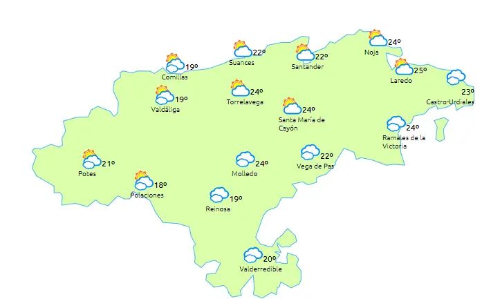 Temperaturas máximas y mínimas previstas: Cabezón de la Sal, 25 y 13 grados; San Vicente de la Barquera, 22 y 13; Santander, 24 y 18; Castro Urdiales, 27 y 17; Potes, 26 y 11; Reinosa, 22 y 9; y Torrelavega, 26 y 16 grados.