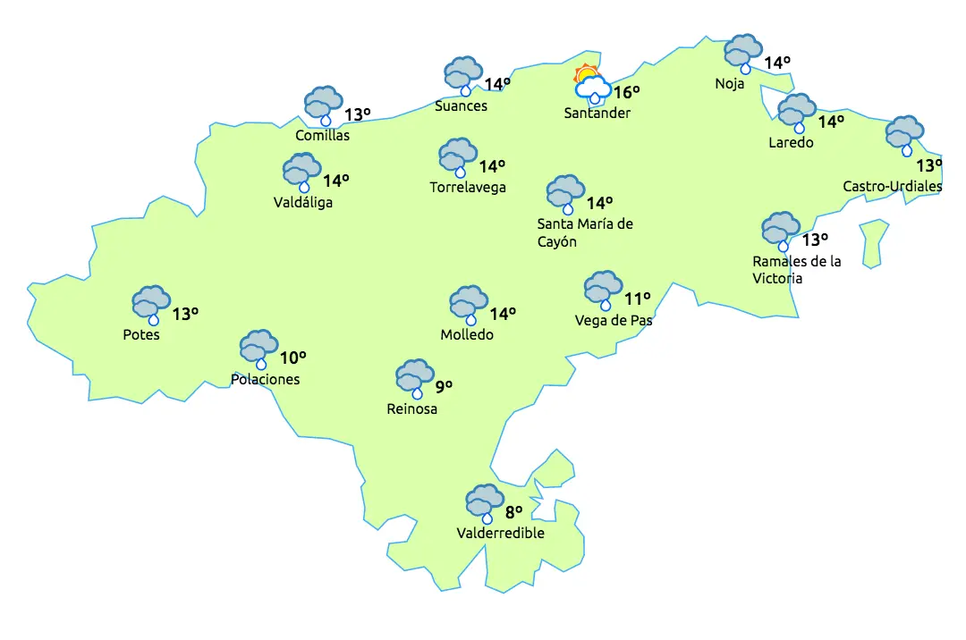 Temperaturas máximas y mínimas previstas: Cabezón de la Sal, 15 y 7 grados; San Vicente de la Barquera, 14 y 8; Santander, 15 y 8; Castro Urdiales, 15 y 9; Potes, 17 y 6; Reinosa, 11 y 4; y Torrelavega, 16 y 7 grados.