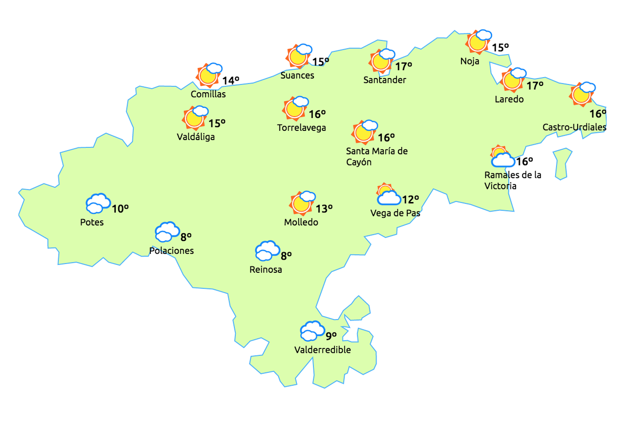 Temperaturas máximas y mínimas previstas: Cabezón de la Sal, 18 y 10 grados; San Vicente de la Barquera, 17 y 9; Santander, 19 y 10; Castro Urdiales, 19 y 10; Potes, 14 y 8; Reinosa, 10 y 4; y Torrelavega, 20 y 10.