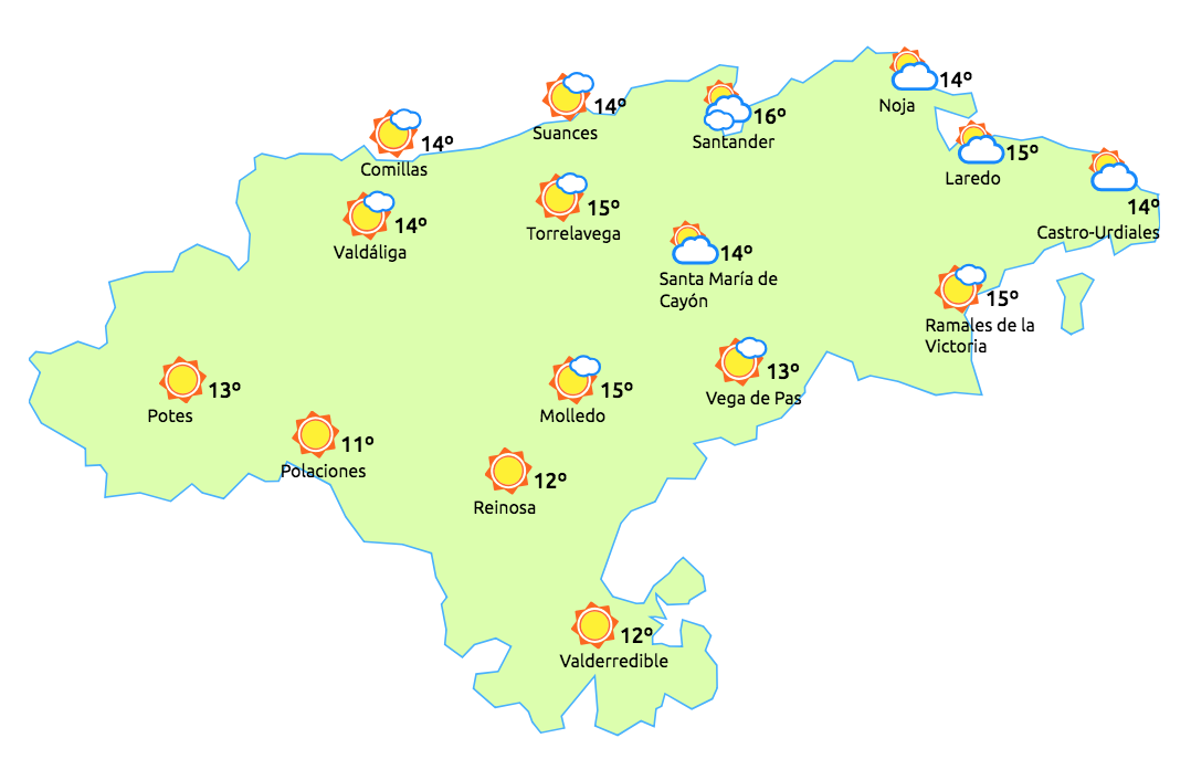 Temperaturas máximas y mínimas previstas: Cabezón de la Sal, 16 y 9 grados; San Vicente de la Barquera, 15 y 9; Santander, 16 y 11; Castro Urdiales, 16 y 11; Potes, 19 y 5; Reinosa, 14 y 3; y Torrelavega, 16 y 9 grados.