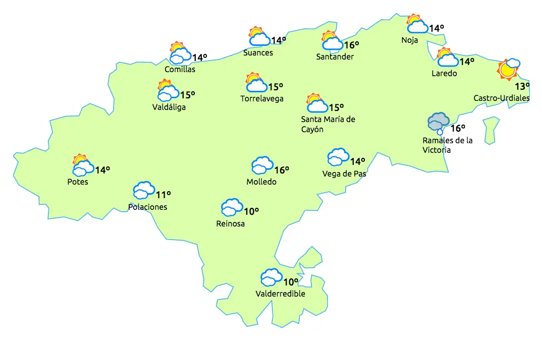 Temperaturas máximas y mínimas previstas: Cabezón de la Sal, 17 y 11 grados; San Vicente de la Barquera, 15 y 10; Santander, 16 y 12; Castro Urdiales, 15 y 8; Potes, 20 y 7; Reinosa, 15 y 6; y Torrelavega, 18 y 11 grados.