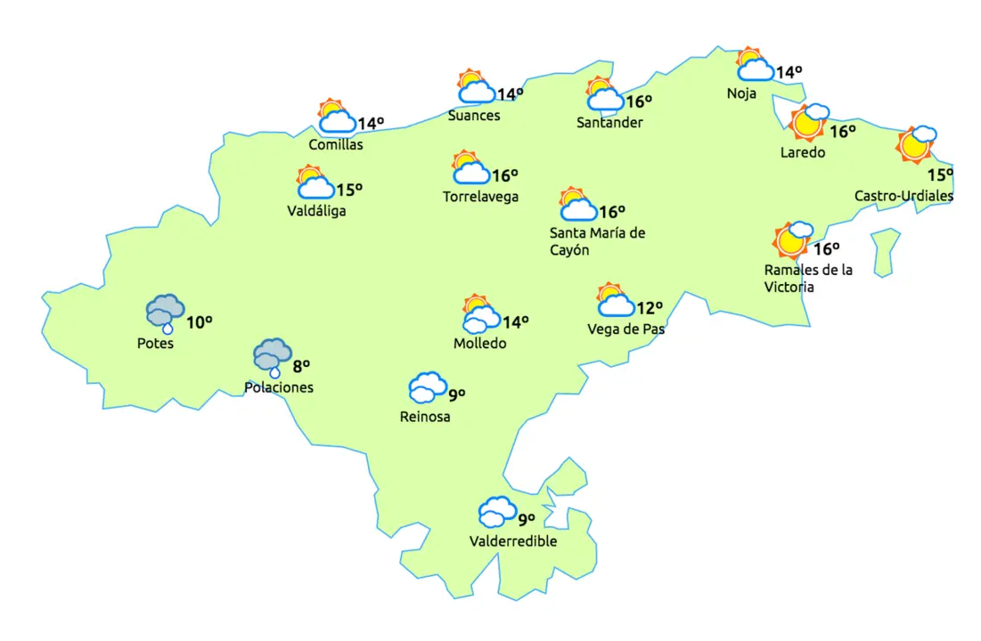 Temperaturas máximas y mínimas previstas: Cabezón de la Sal, 17 y 11 grados; San Vicente de la Barquera, 15 y 7; Santander, 18 y 6; Castro Urdiales, 18 y 6; Potes, 16 y 5; Reinosa, 12 y 6; y Torrelavega, 20 y 11.