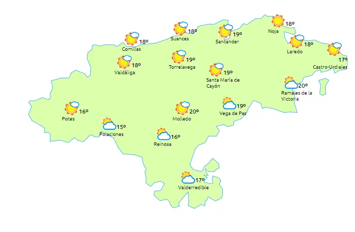 Temperaturas máximas y mínimas previstas: Cabezón de la Sal, 19 y 11 grados; San Vicente de la Barquera, 19 y 11; Santander, 19 y 12; Castro Urdiales, 19 y 12; Potes, 20 y 7; Reinosa, 18 y 4; y Torrelavega, 21 y 11 grados.