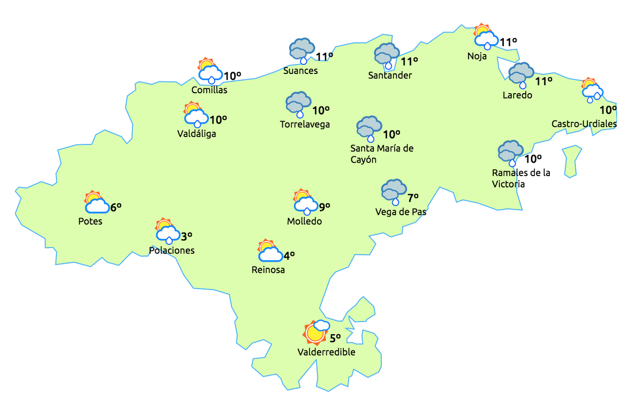 Temperaturas máximas y mínimas previstas: Cabezón de la Sal, 12 y 10 grados; San Vicente de la Barquera, 12 y 5; Santander, 13 y 5; Castro Urdiales, 14 y 5; Potes, 11 y 0; Reinosa, 7 y 3; y Torrelavega, 13 y 10 grados.