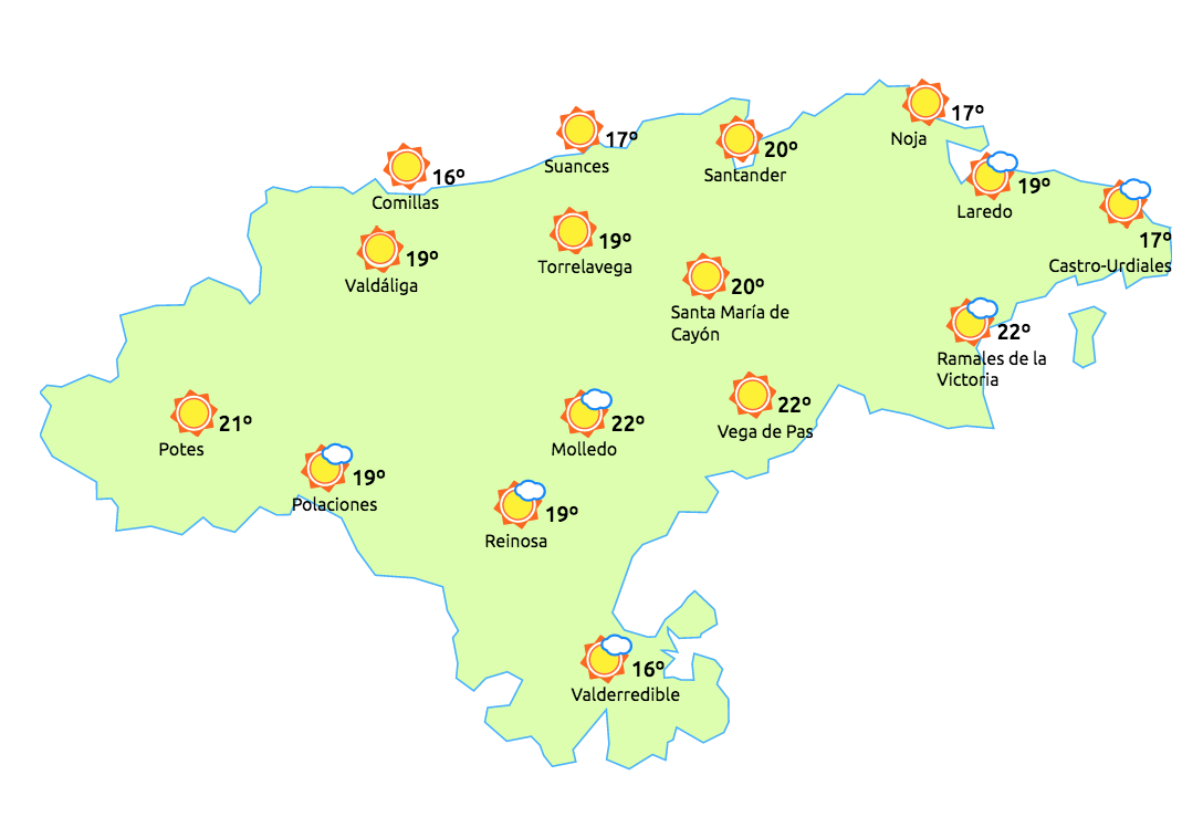 Temperaturas máximas y mínimas previstas: Cabezón de la Sal, 19 y 9 grados; San Vicente de la Barquera, 17 y 9; Santander, 18 y 10; Castro Urdiales, 19 y 10; Potes, 25 y 9; Reinosa, 21 y 6; y Torrelavega, 20 y 8 grados.