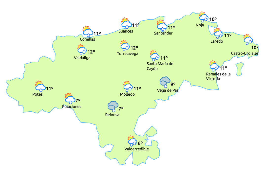 La Agencia Estatal de Meteorología prevé en Cantabria para este domingo, día 18, predominio de cielos nubosos con lluvias y chubascos que comenzarán en el nordeste, donde serán más abundantes y persistentes, siendo en el resto débiles en general.