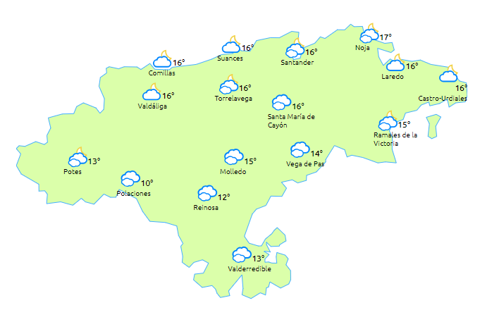 Temperaturas máximas y mínimas previstas: Cabezón de la Sal, 19 y 14 grados; San Vicente de la Barquera, 20 y 14; Santander, 20 y 15; Castro Urdiales, 20 y 13; Potes, 20 y 10; Reinosa, 16 y 6; y Torrelavega, 20 y 15 grados.
