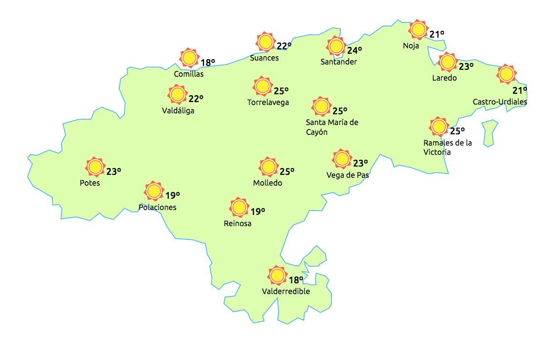Temperaturas máximas y mínimas previstas: Cabezón de la Sal, 24 y 13 grados; San Vicente de la Barquera, 21 y 9; Santander, 23 y 11; Castro Urdiales, 22 y 11; Potes, 26 y 7; Reinosa, 21 y 9; y Torrelavega, 26 y 12 grados.