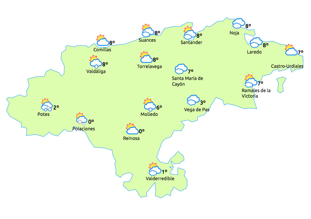 Temperaturas máximas y mínimas previstas: Cabezón de la Sal, 8 y 0 grados; San Vicente de la Barquera, 8 y 2; Santander, 9 y 5; Castro Urdiales, 9 y 7; Potes, 8 y -3; Reinosa, 1 y -8; y Torrelavega, 10 y 2 grados.