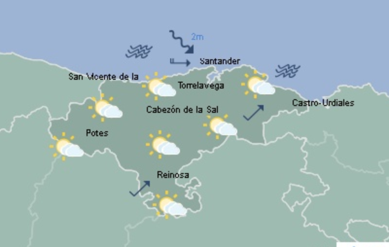 Temperaturas máximas y mínimas previstas: Cabezón de la Sal, 17 y 9 grados; San Vicente de la Barquera, 16 y 9; Santander, 16 y 11; Castro Urdiales, 16 y 10; Potes, 18 y 3; Reinosa, 12 y 2; y Torrelavega, 18 y 9 grados.