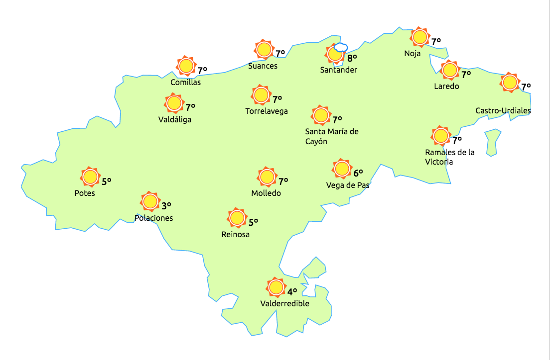 Temperaturas máximas y mínimas previstas: Cabezón de la Sal, 10 y -1 grados; San Vicente de la Barquera, 8 y 2; Santander, 10 y 2; Castro Urdiales, 10 y 2; Potes, 11 y -2; Reinosa, 7 y -4; y Torrelavega, 11 y -1 grados.