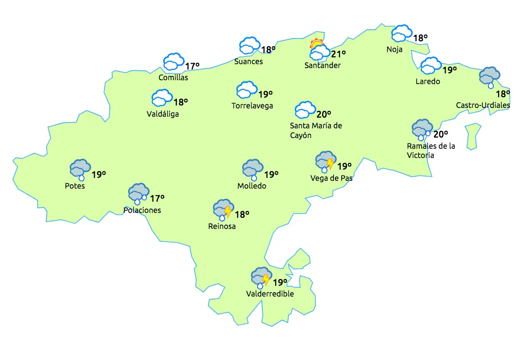 Temperaturas máximas y mínimas previstas: Cabezón de la Sal, 20 y 13 grados; San Vicente de la Barquera, 18 y 14; Santander, 20 y 14; Castro Urdiales, 20 y 14; Potes, 24 y 13; Reinosa, 21 y 9; y Torrelavega, 21 y 13 grados.