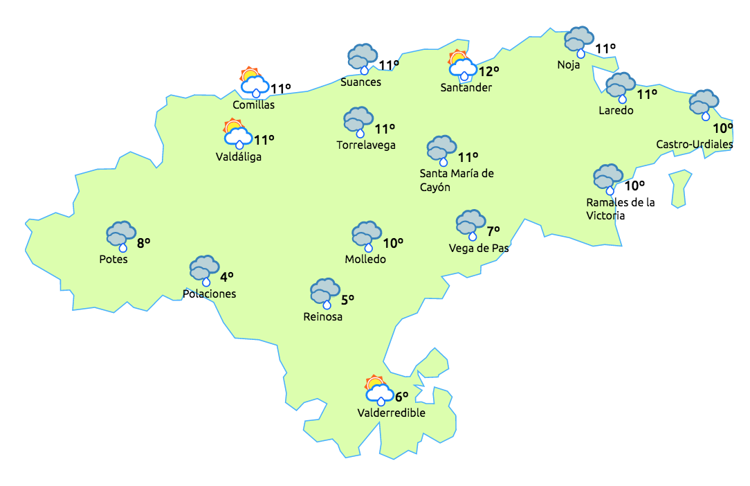 Temperaturas máximas y mínimas previstas: Cabezón de la Sal, 12 y 9 grados; San Vicente de la Barquera, 12 y 8; Santander, 13 y 8; Castro Urdiales, 13 y 8; Potes, 12 y 7; Reinosa, 6 y 3; y Torrelavega, 13 y 9 grados.