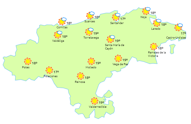 Temperaturas máximas y mínimas previstas: Cabezón de la Sal, 20 y 10 grados; San Vicente de la Barquera, 18 y 10; Santander, 20 y 12; Castro Urdiales, 18 y 11; Potes, 23 y 6; Reinosa, 19 y 0; y Torrelavega, 20 y 10 grados.