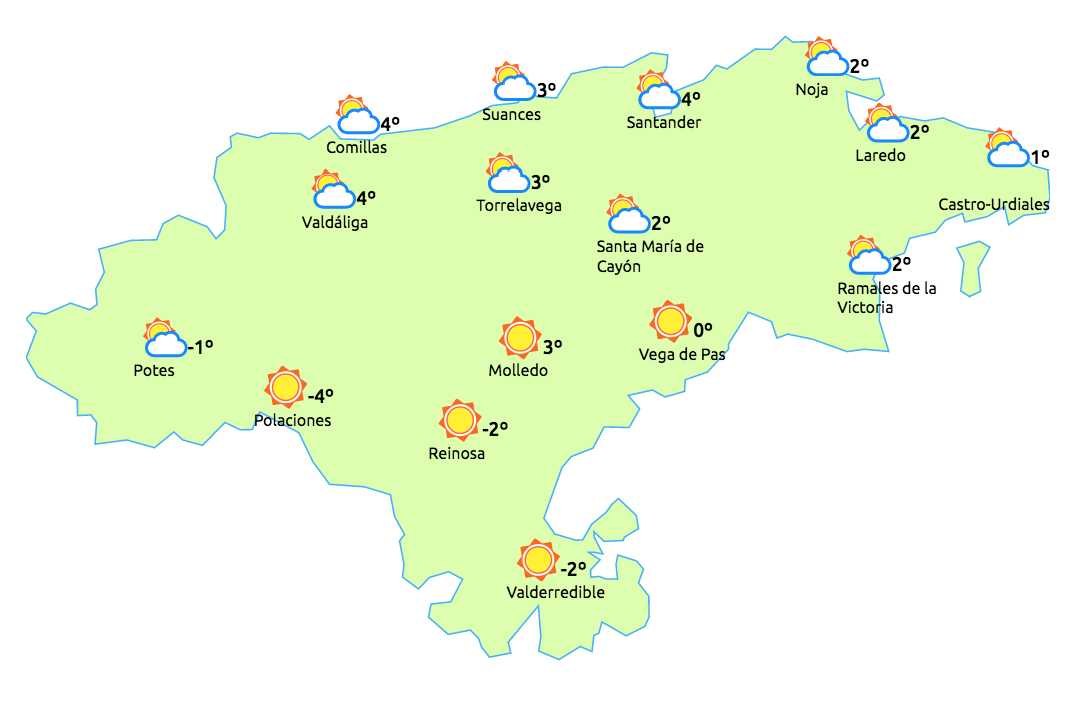 Temperaturas máximas y mínimas previstas: Cabezón de la Sal, 5 y -2 grados; San Vicente de la Barquera, 5 y -2; Santander, 6 y -3; Castro Urdiales, 5 y -2; Potes, 5 y -5; Reinosa, 1 y -8; y Torrelavega, 5 y -1.