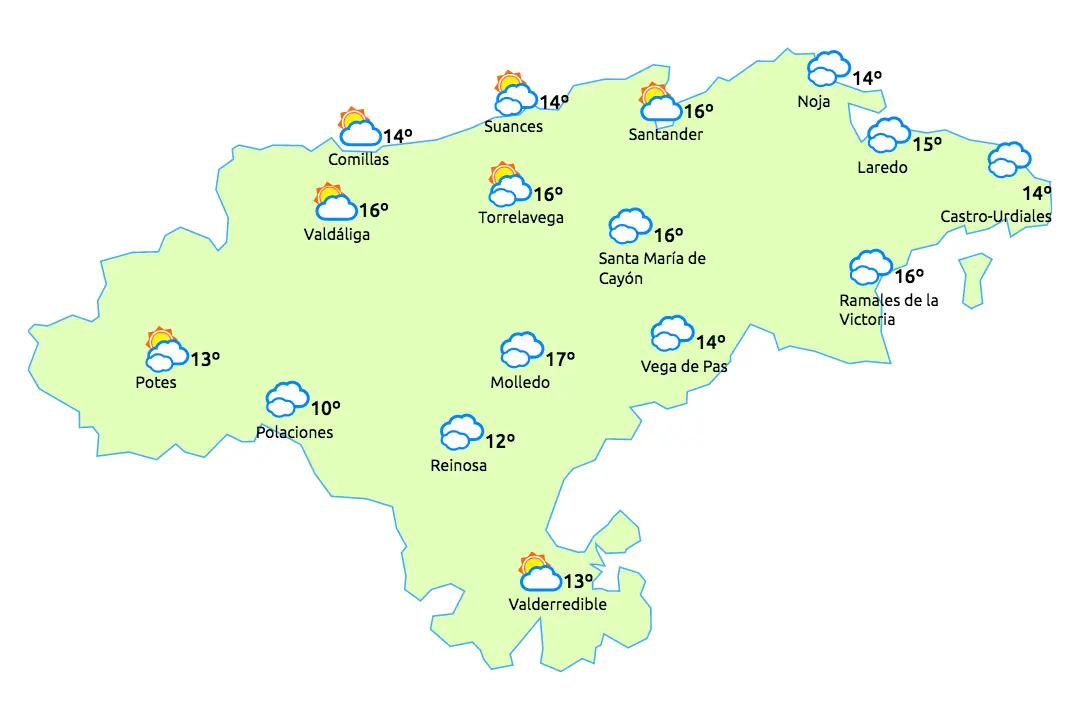 Temperaturas máximas y mínimas previstas: Cabezón de la Sal, 17 y 8 grados; San Vicente de la Barquera, 15 y 7; Santander, 15 y 10; Castro Urdiales, 16 y 9; Potes, 19 y 4; Reinosa, 15 y 0; y Torrelavega, 17 y 7 grados.
