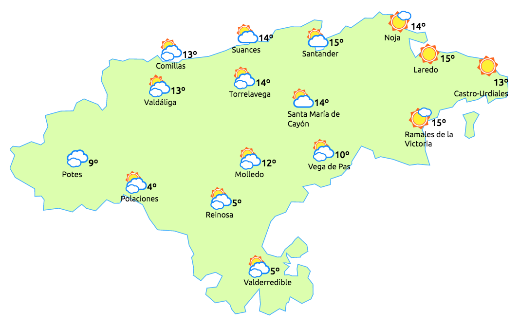 Temperaturas máximas y mínimas previstas: Cabezón de la Sal, 14 y 2 grados; San Vicente de la Barquera, 15 y 4; Santander, 15 y 6; Castro Urdiales, 16 y 6; Potes, 12 y 1; Reinosa, 7 y -2; y Torrelavega, 16 y 4 grados.