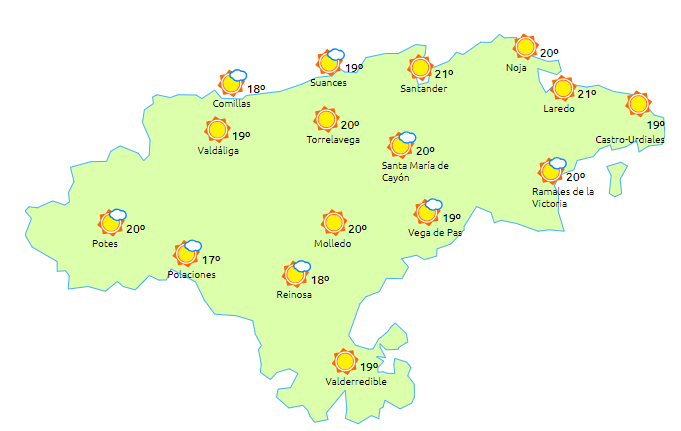 Temperaturas máximas y mínimas previstas: Cabezón de la Sal, 20 y 16 grados; San Vicente de la Barquera, 19 y 16; Santander, 20 y 14; Castro Urdiales, 21 y 14; Potes, 23 y 15; Reinosa, 20 y 9; y Torrelavega, 20 y 16 grados.