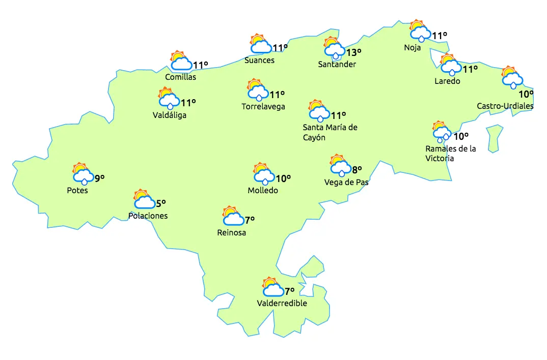 Temperaturas máximas y mínimas previstas: Cabezón de la Sal, 13 y 7 grados; San Vicente de la Barquera, 13 y 6; Santander, 13 y 7; Castro Urdiales, 13 y 7; Potes, 13 y 4; Reinosa, 9 y 0; y Torrelavega, 13 y 7 grados.