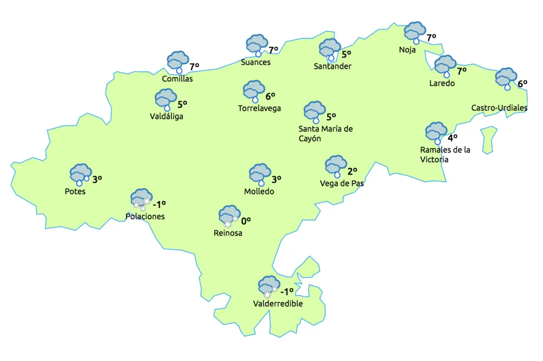 Temperaturas máximas y mínimas previstas: Cabezón de la Sal, 7 y 3 grados; San Vicente de la Barquera, 8 y 4; Santander, 8 y 5; Castro Urdiales, 8 y 5; Potes, 5 y 0; Reinosa, 1 y -3; y Torrelavega, 8 y 4.