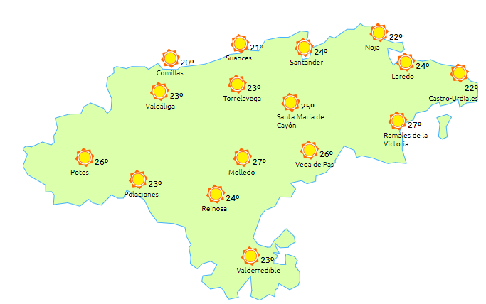 Temperaturas máximas y mínimas previstas: Cabezón de la Sal, 23 y 10 grados; San Vicente de la Barquera, 20 y 9; Santander, 21 y 12; Castro Urdiales, 23 y 10; Potes, 28 y 6; Reinosa, 26 y 3; y Torrelavega, 23 y 10 grados.