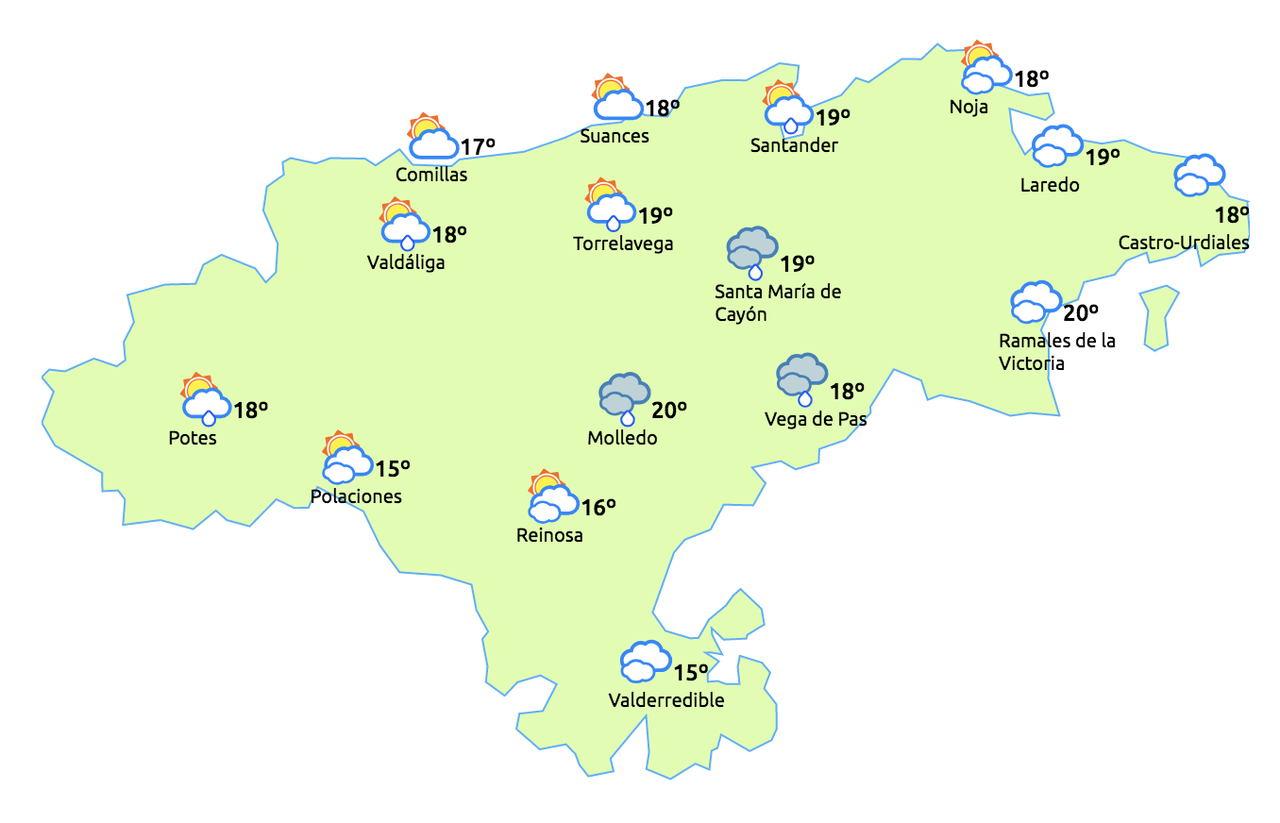 Temperaturas máximas y mínimas previstas: Cabezón de la Sal, 19 y 11 grados; San Vicente de la Barquera, 18 y 12; Santander, 19 y 13; Castro Urdiales, 20 y 13; Potes, 21 y 9; Reinosa, 17 y 5; y Torrelavega, 20 y 10 grados.
