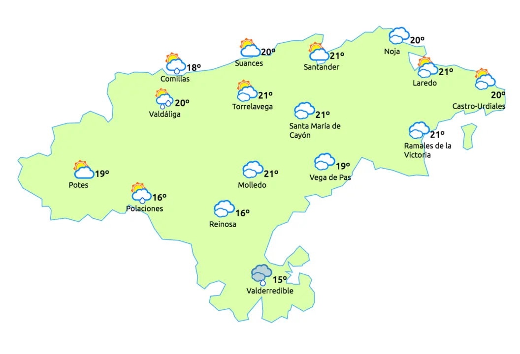 Temperaturas máximas y mínimas previstas: Cabezón de la Sal, 22 y 15 grados; San Vicente de la Barquera, 18 y 15; Santander, 24 y 16; Castro Urdiales, 24 y 16; Potes, 25 y 15; Reinosa, 20 y 12; y Torrelavega, 25 y 15 grados.