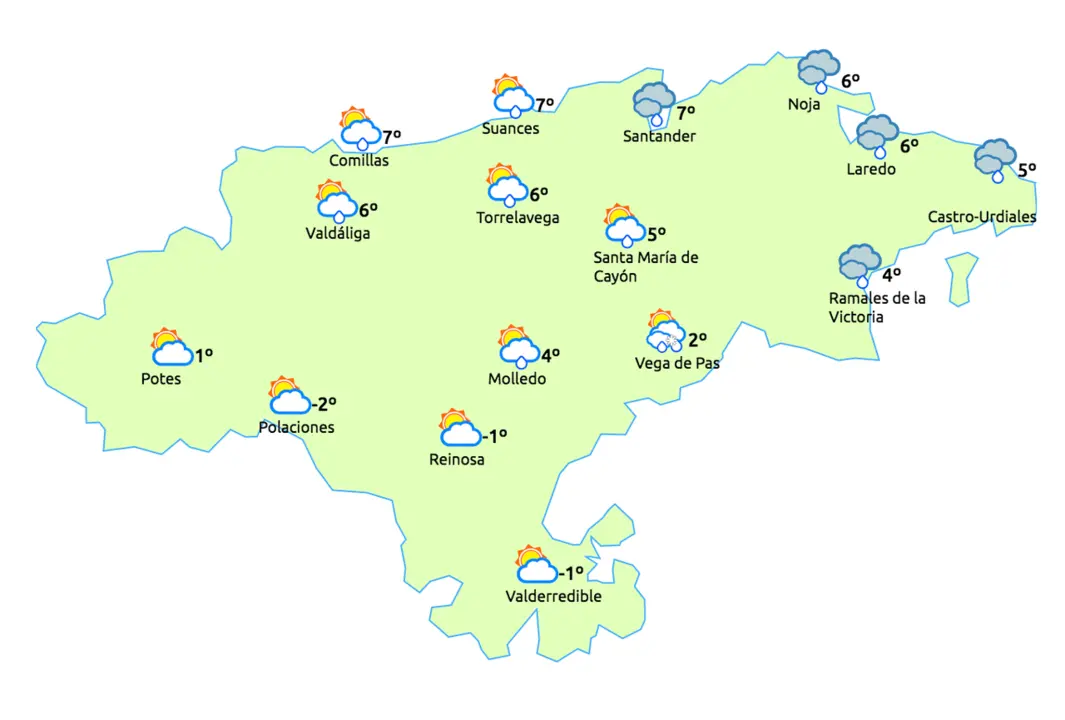 Temperaturas máximas y mínimas previstas: Cabezón de la Sal, 7 y 0 grados; San Vicente de la Barquera, 8 y 1; Santander, 8 y 3; Castro Urdiales, 8 y 3; Potes, 5 y -5; Reinosa, 1 y -8; y Torrelavega, 8 y 1.