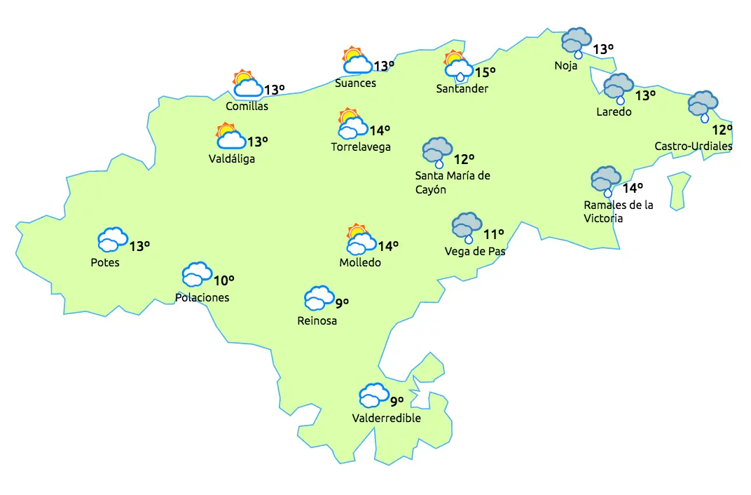 Temperaturas máximas y mínimas previstas: Cabezón de la Sal, 15 y 10 grados; San Vicente de la Barquera, 15 y 10; Santander, 15 y 11; Castro Urdiales, 15 y 10; Potes, 17 y 6; Reinosa, 12 y 3; y Torrelavega, 16 y 10 grados.