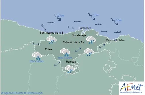 Temperaturas máximas y mínimas previstas: Cabezón de la Sal, 16 y 7 grados; San Vicente de la Barquera, 15 y 8; Santander, 16 y 9; Castro Urdiales, 16 y 8; Potes, 14 y 2; Reinosa, 8 y 1; y Torrelavega, 17 y 8 grados.