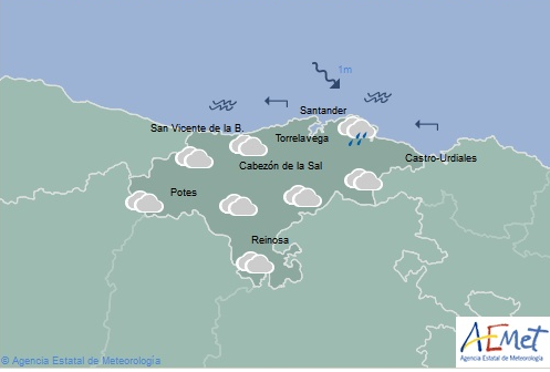 Temperaturas máximas y mínimas previstas: Cabezón de la Sal, 19 y 11 grados; San Vicente de la Barquera, 16 y 10; Santander, 17 y 12; Castro Urdiales, 16 y 7; Potes, 22 y 9; Reinosa, 17 y 2; y Torrelavega, 20 y 12 grados.