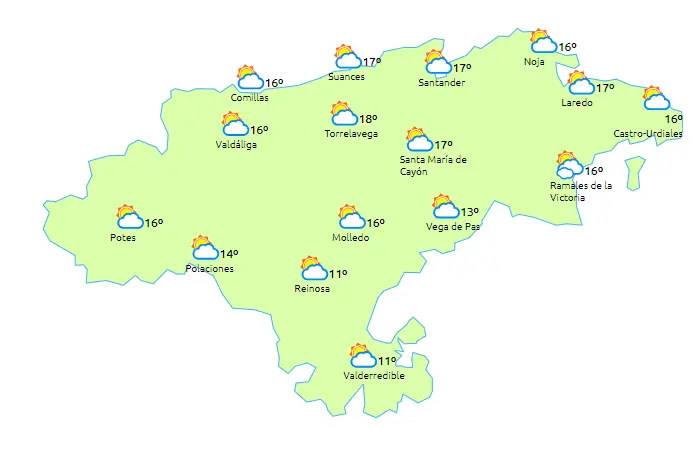Temperaturas máximas y mínimas previstas: Cabezón de la Sal, 19 y 9 grados; San Vicente de la Barquera, 17 y 8; Santander, 19 y 10; Castro Urdiales, 18 y 10; Potes, 19 y 6; Reinosa, 12 y 3; y Torrelavega, 20 y 10 grados.