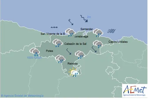 Temperaturas máximas y mínimas previstas: Cabezón de la Sal, 11 y 6 grados; San Vicente de la Barquera, 11 y 8; Santander, 12 y 9; Castro Urdiales, 11 y 7; Potes, 8 y 0; Reinosa, 5 y -2; y Torrelavega, 11 y 8 grados.