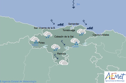 Temperaturas máximas y mínimas previstas: Cabezón de la Sal, 12 y 6 grados; San Vicente de la Barquera, 12 y 6; Santander, 12 y 8; Castro Urdiales, 12 y 8; Potes, 9 y 1; Reinosa, 5 y -2; y Torrelavega, 12 y 7 grados.