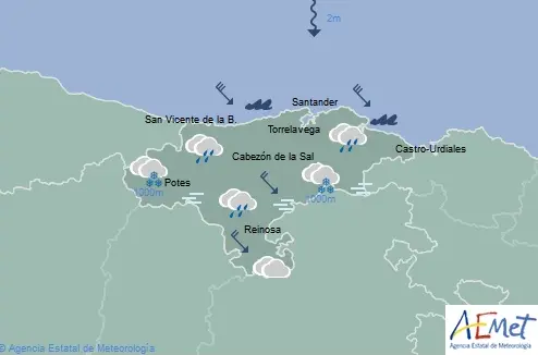 La Agencia Estatal de Meteorología (AEMET) prevé en Cantabria para este domingo día 27, cielos nubosos aumentando a cubiertos con claros en el litoral en las horas centrales; precipitaciones generalizadas, menos intensas cuanto más al sur, y brumas y posibilidad de nieblas en zonas altas. Cota de nieve en descenso de 1.000 a 700-800 metros.