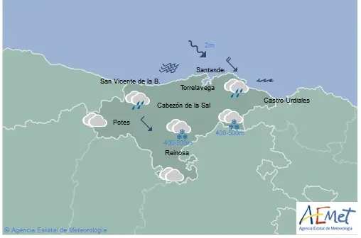 Temperaturas máximas y mínimas previstas: Cabezón de la Sal, 9 y 1 grados; San Vicente de la Barquera, 11 y 5; Santander, 10 y 6; Castro Urdiales, 11 y 5; Potes, 7 y -5; Reinosa, 3 y -8; y Torrelavega, 11 y 3 grados.
