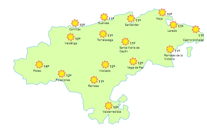 Temperaturas máximas y mínimas previstas: Cabezón de la Sal, 11 y 4 grados; San Vicente de la Barquera, 12 y 6; Santander, 12 y 6; Castro Urdiales, 11 y 5; Potes, 16 y 3; Reinosa, 13 y 2; y Torrelavega, 12 y 3 grados.