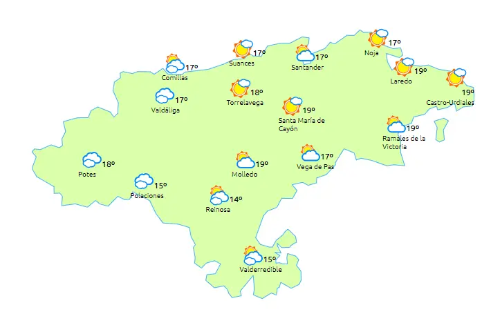 Temperaturas máximas y mínimas previstas: Cabezón de la Sal, 18 y 7 grados; San Vicente de la Barquera, 17 y 6; Santander, 19 y 7; Castro Urdiales, 20 y 6; Potes, 22 y 8; Reinosa, 15 y 0; y Torrelavega, 19 y 6 grados.