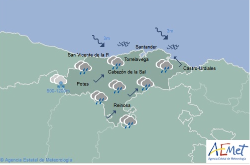 Temperaturas máximas y mínimas previstas: Cabezón de la Sal, 15 y 4 grados; San Vicente de la Barquera, 14 y 5; Santander, 15 y 8; Castro Urdiales, 14 y 7; Potes, 17 y -1; Reinosa, 12 y -4; y Torrelavega, 16 y 5 grados.