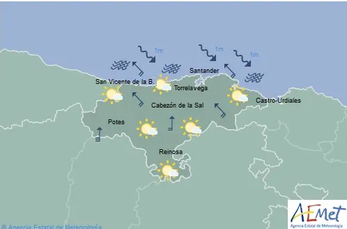 Temperaturas máximas y mínimas previstas: Cabezón de la Sal, 25 y 13 grados; San Vicente de la Barquera, 21 y 10; Santander, 22 y 13; Castro Urdiales, 22 y 11; Potes, 26 y 13; Reinosa, 27 y 8; y Torrelavega, 27 y 12 grados.