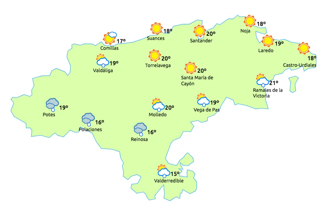 Temperaturas máximas y mínimas previstas: Cabezón de la Sal, 21 y 14 grados; San Vicente de la Barquera, 19 y 12; Santander, 20 y 12; Castro Urdiales, 19 y 13; Potes, 23 y 10; Reinosa, 19 y 6; y Torrelavega, 22 y 13 grados.