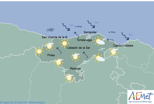 Temperaturas máximas y mínimas previstas: Cabezón de la Sal, 18 y 8 grados; San Vicente de la Barquera, 16 y 9; Santander, 17 y 10; Castro Urdiales, 16 y 11; Potes, 22 y 5; Reinosa, 18 y 2; y Torrelavega, 19 y 8 grados.
