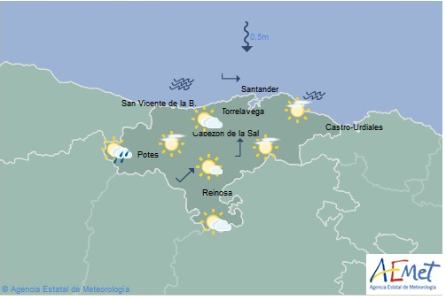Temperaturas máximas y mínimas previstas: Cabezón de la Sal, 23 y 15 grados; San Vicente de la Barquera, 20 y 14; Santander, 21 y 16; Castro Urdiales, 22 y 14; Potes, 29 y 13; Reinosa, 25 y 11; y Torrelavega, 23 y 15 grados.