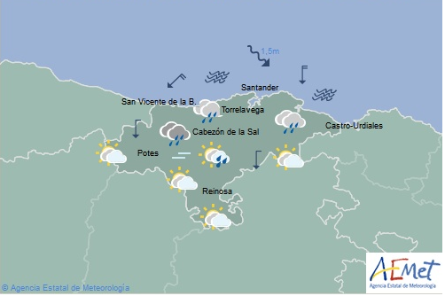 Temperaturas máximas y mínimas previstas: Cabezón de la Sal, 17 y 12 grados; San Vicente de la Barquera, 17 y 11; Santander, 18 y 13; Castro Urdiales, 17 y 14; Potes, 17 y 10; Reinosa, 14 y 7; y Torrelavega, 19 y 13 grados.