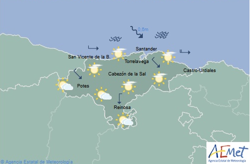 Temperaturas máximas y mínimas previstas: Cabezón de la Sal, 18 y 11 grados; San Vicente de la Barquera, 17 y 10; Santander, 17 y 12; Castro Urdiales, 18 y 12; Potes, 21 y 9; Reinosa, 18 y 5; y Torrelavega, 20 y 12 grados.