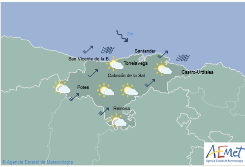 Temperaturas máximas y mínimas previstas: Cabezón de la Sal, 18 y 9 grados; San Vicente de la Barquera, 17 y 7; Santander, 18 y 10; Castro Urdiales, 18 y 7; Potes, 16 y 6; Reinosa, 11 y 2; y Torrelavega, 19 y 7 grados.