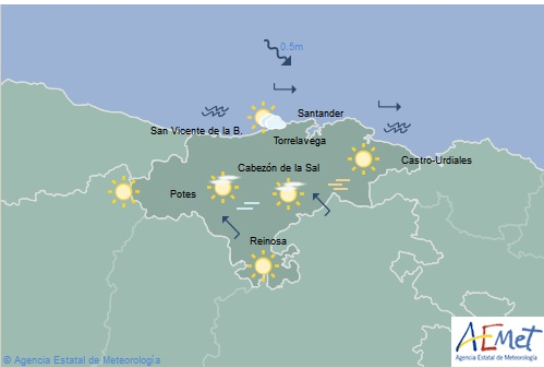 Temperaturas máximas y mínimas previstas: Cabezón de la Sal, 24 y 16 grados; San Vicente de la Barquera, 20 y 16; Santander, 24 y 17; Castro Urdiales, 30 y 18; Potes, 37 y 20; Reinosa, 36 y 17; y Torrelavega, 23 y 16 grados.