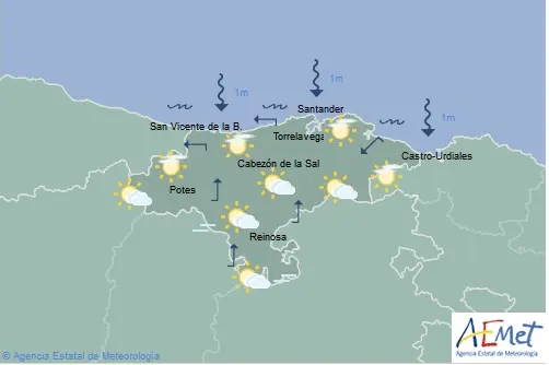 Temperaturas máximas y mínimas previstas: Cabezón de la Sal, 27 y 18 grados; San Vicente de la Barquera, 24 y 18; Santander, 28 y 17; Castro Urdiales, 27 y 18; Potes, 32 y 19; Reinosa, 30 y 15; y Torrelavega, 32 y 18 grados.