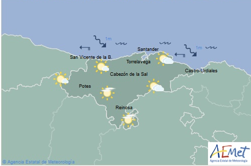 Temperaturas máximas y mínimas previstas: Cabezón de la Sal, 26 y 9 grados; San Vicente de la Barquera, 25 y 10; Santander, 24 y 12; Castro Urdiales, 22 y 11; Potes, 24 y 6; Reinosa, 20 y 2; y Torrelavega, 27 y 10 grados.
