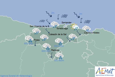 Temperaturas máximas y mínimas previstas: Cabezón de la Sal, 10 y 4 grados; San Vicente de la Barquera, 11 y 6; Santander, 11 y 8; Castro Urdiales, 11 y 6; Potes, 7 y -3; Reinosa, 3 y -5; y Torrelavega, 11 y 5 grados.
